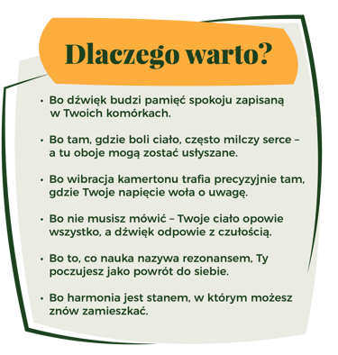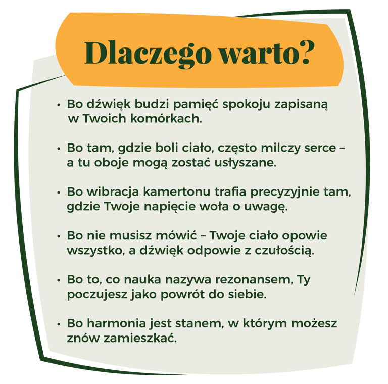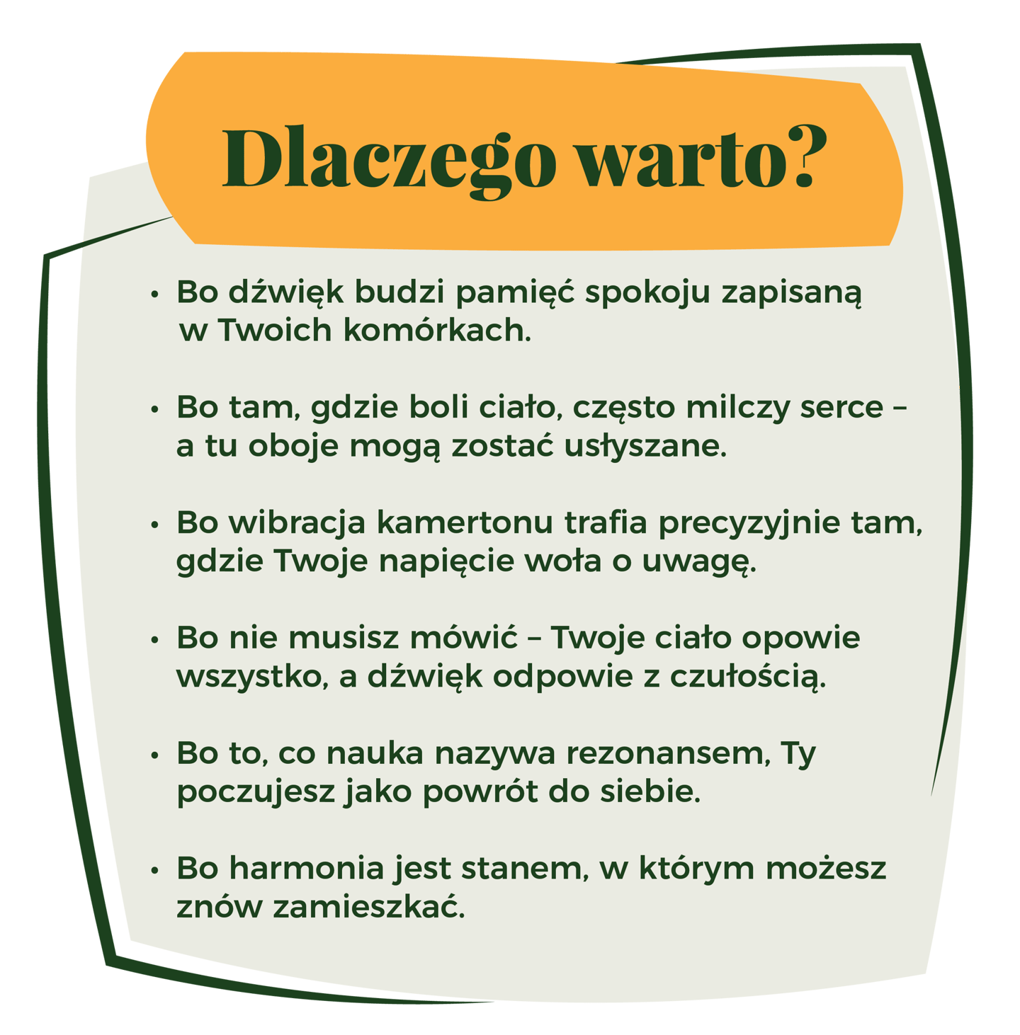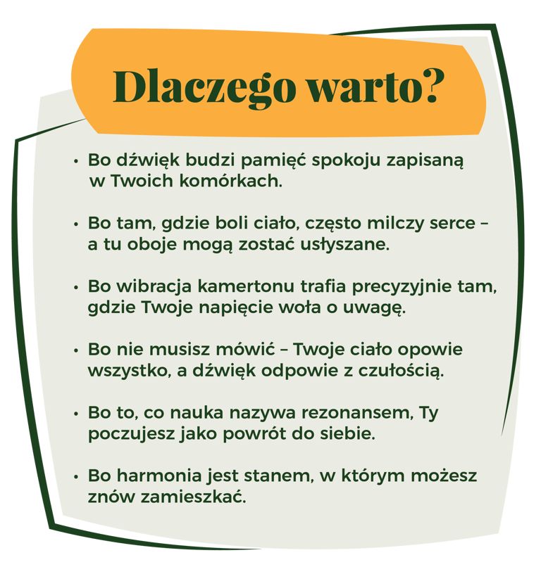 A skoro wszystko w Tobie drga, to dźwięk ma moc, by to zestroić – łagodnie, ale głęboko.