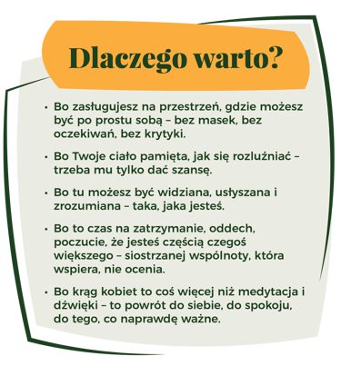 To właśnie tu możesz usiąść w siostrzanym kręgu wspólnoty, gdzie jednocześnie doceniana jest Twoja indywidualność. Gdzie jesteś ważna. Gdzie jesteś zaopiekowana. Gdzie jesteś otulona wsparciem, miłością i akceptacją.