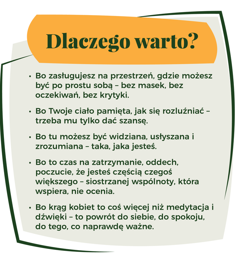 Każdy krąg prowadzony jest w rytmie pełni księżyca i dostosowany do energii znaku, w którym ona się znajduje. Medytacja prowadzona, dźwiękoterapeutyczne ukojenie, zioła wspierające procesy wewnętrzne oraz bezpieczna przestrzeń do dzielenia się tym, co w Tobie żywe – to wszystko czeka na Ciebie w naszym kręgu. Bez względu na to, czy posiadasz doświadczenie w tym temacie czy zupełnie nie.