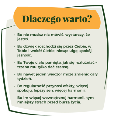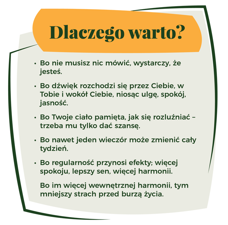 Każde spotkanie rozpoczynam krótką, stałą medytacją oraz prostą techniką oddechową (zmienianą co około miesiąc), dzięki czemu, nabierasz wprawy, by móc stosować również w domu. Potem otulam Cię dźwiękami, które płyną przez Ciebie, w Tobie i wokół Ciebie – w całej grupie. Każdy dźwięk zaprasza Twoje ciało do rozluźnienia, umysł do spowolnienia, a serce do powrotu do swojego rytmu. Pozwól sobie zanurzyć się w łagodnym rytmie teraźniejszości - gdzie nie musisz nic robić, a jedynie BYĆ.
