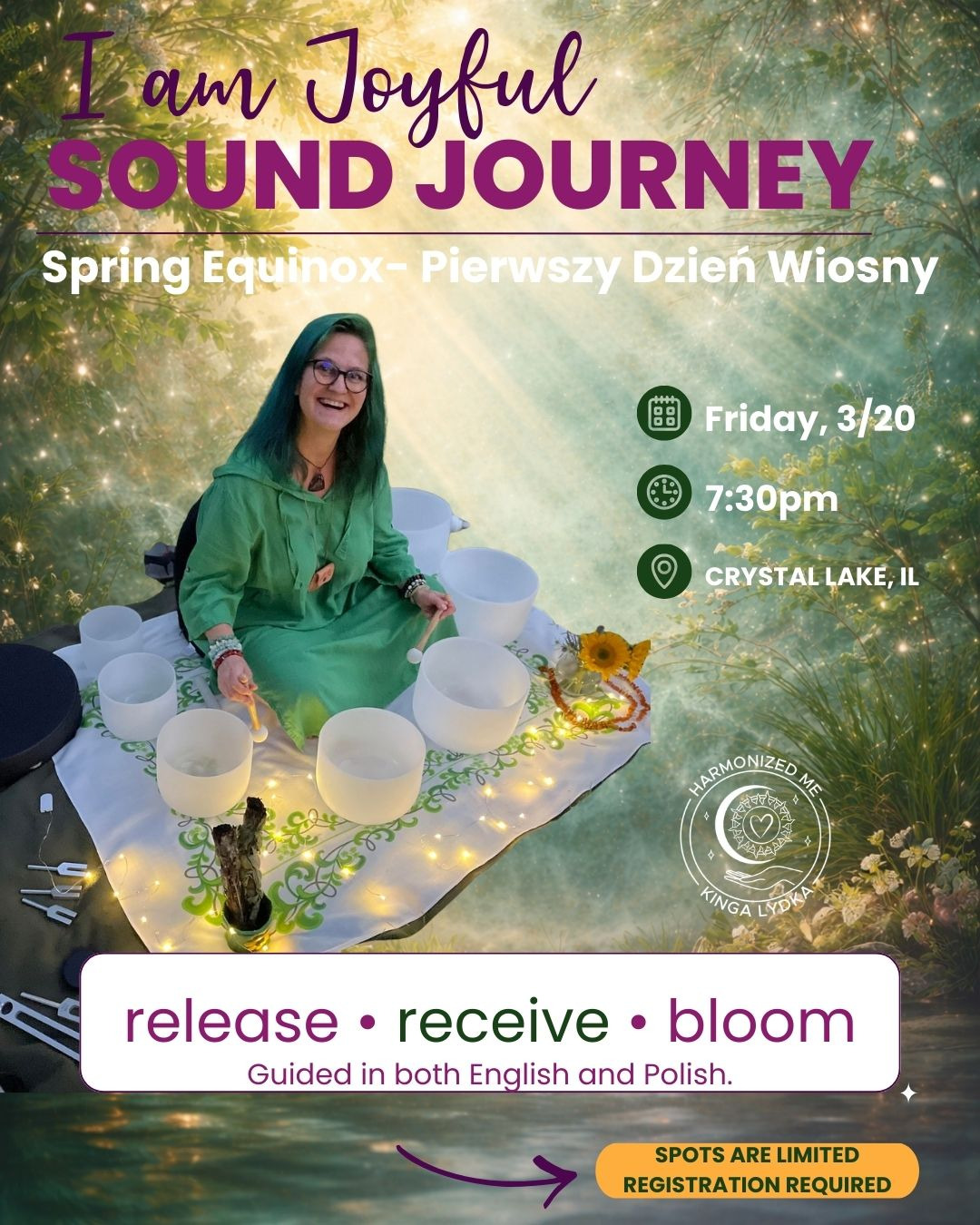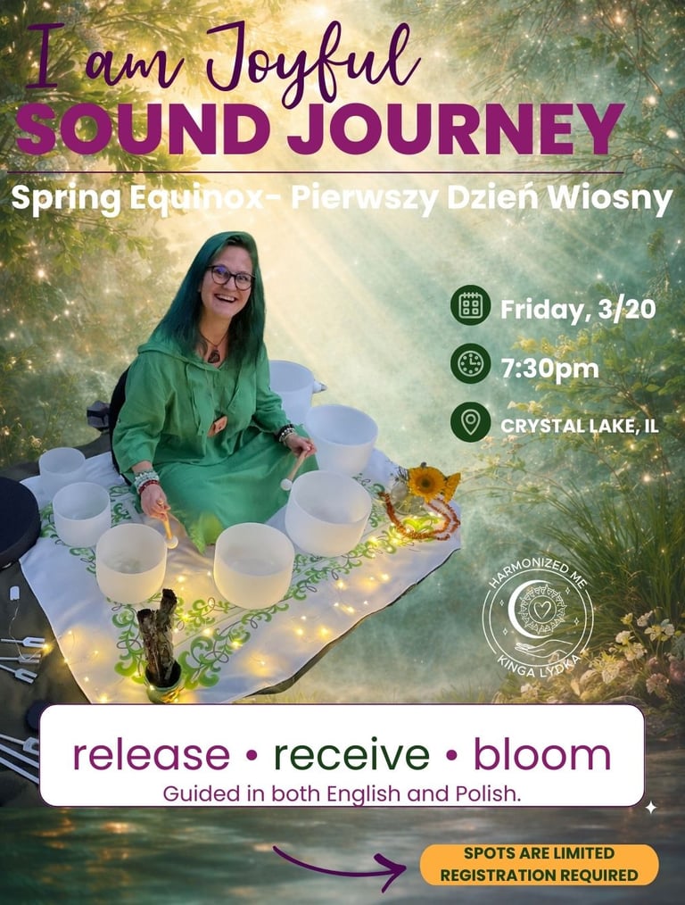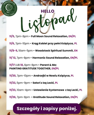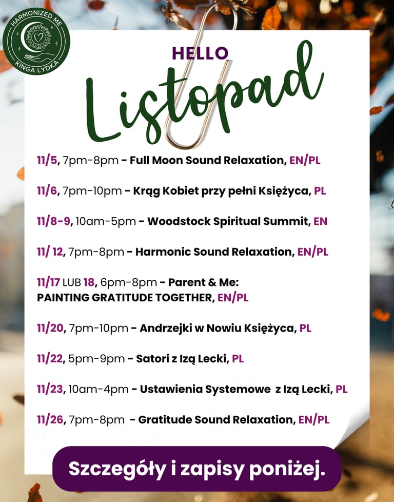 Dostępne również SESJE PRYWATNE. Szczegóły tutaj: https://harmonizedme.com/pl/sound-bath