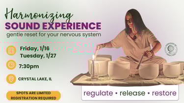 Cotygodniowe sesje dźwiękoterapii to otulająca przestrzeń relaksu, oddechu i harmonii, przy dźwiękach mis kryształowych, bębnów, dzwonków koshi i kamertonów.