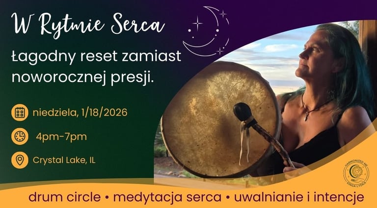 Medytacja serca pomoże Ci wrócić do wewnętrznego centrum. Wspólny rytm bębnów ugruntuje Cię w ciele. Taniec pozwoli rozpuścić to, co utkwiło w emocjach. Praktyka odcinania i intencji domknie to, co stare, i delikatnie zaprosi nowe - bez forsowania.