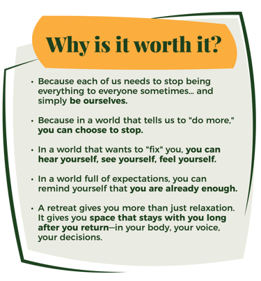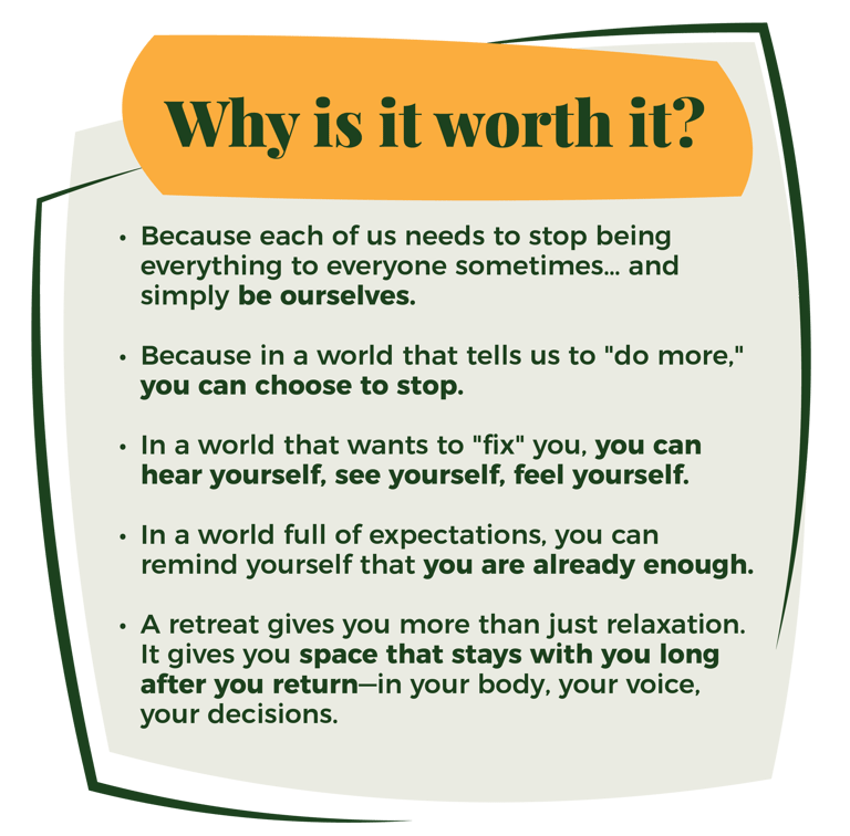 Ready to take a break from being a wife, mother, daughter, employee... and dedicate time to feeling your beauty, POWER, and intuition? To feel your gentleness and strength - without masks, without pressure, without obligations? A time for respite, away from everyday life, responsibilities, and chaos? A time where you don't have to prove anything. Where you are seen, heard, and accepted, exactly as YOU ARE.