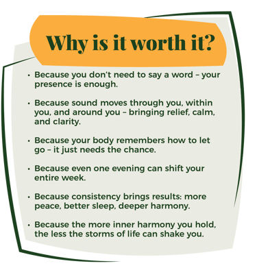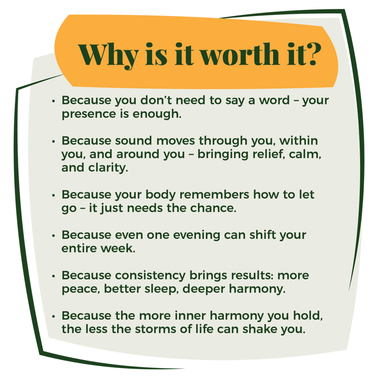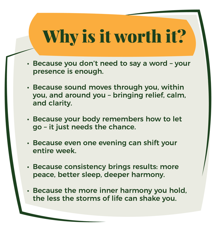 Each session begins with a short, guided meditation and a simple breathing technique, rotated about once a month, helping you build a method you can also use at home. Then I gently hold you in sound – flowing through you, within you, and around you. Every vibration invites your body to soften, your mind to slow down, and your heart to relax its rhythm. Let yourself melt into the gentle rhythm of the present moment – where you don’t need to do anything, just be.