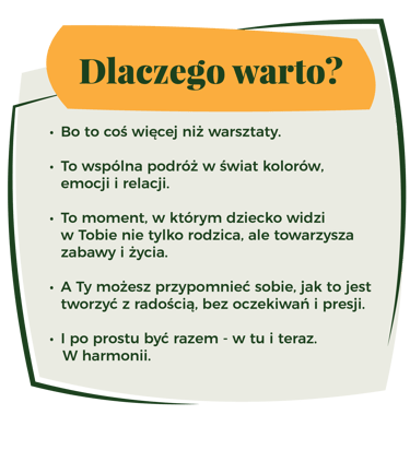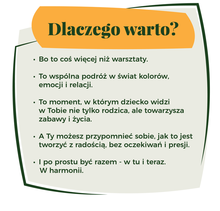 Bo te warsztaty, to nie tylko zwykłe malowanie. To lekcje malowania życia. To pozwolenie sobie na kreatywność według własnej fantazji. To otwartość na naukę, że każdy sposób jest dobry, tylko ma inne efekty. Decyzja zawsze należy do Ciebie i do Twojego dziecka. Tak jak w życiu. A podczas takich zajęć można to sobie po prostu… poćwiczyć.